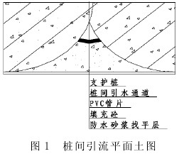 采用有組織的引流的處理方法, 可以解決這種盲目封堵而造成滲水四散的尷尬局面。具體做法是: 在樁間找平層施工前, 先用剖開的 PVC 管片或竹片順著樁的凹位做一引水的通道 (見圖 1) ,將樁間的滲水引到環繞基坑內周邊基底的有組織排水盲溝和集水井中, 在集水井位置將水抽走,降低地下水水位, 可解決基坑地面和樁間找平層的滲水問題, 滿足底板和壁板 YN 防水卷材施工的干燥度條件, 保證防水施工的效果。