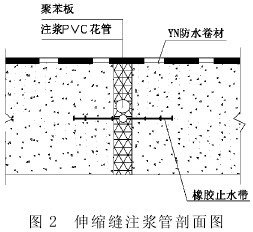 澆筑混凝土前檢查和清理橡膠止水帶, 防止混凝土和橡膠止水帶存在夾渣形成空隙; 加強伸縮縫的混凝土振搗, 使橡膠止水帶與混凝土粘結密實, 防止橡膠止水帶底部混凝土產生空離而漏水。另外在混凝土澆筑前, 在伸縮縫橡膠止水帶迎水面增設預埋注漿 PVC 花管。花管的制作可以采用 Φ20 的 PVC 管, 用直徑 Φ8mm 的手槍鉆,在 PVC 管上每隔 20~30cm 交錯鉆孔, 并用水泥袋紙將鉆孔纏住封口, 以防止未注漿前, 混凝土漿將鉆孔賭塞, 待結構混凝土收縮到一定階段后,對花管進行壓力注漿, 注入柔性防水材料水溶性聚氨酯, 以填充混凝土和橡膠止水帶之間的微細縫隙, 加強防水薄弱部位 (見圖 2)。