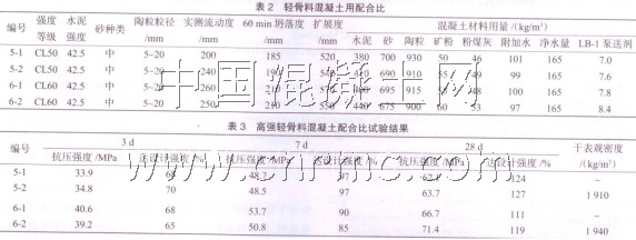 表1中粉煤灰陶粒的檢測結果均符合標準要求,這對我們進行高強輕骨料混凝土的試驗研究提供了保障。依據JGJ 51-2002《輕骨料混凝土技術規程》我們設計了高強輕骨料混凝土配合比和高強輕骨料自密實混凝土配合比,不僅強度滿足設計要求,而且混凝土干表觀密度也降了下來。