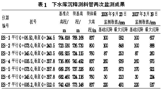 下水庫共埋設(shè)沉降測斜管7個,其分布情況和監(jiān)測數(shù)據(jù)如表1。