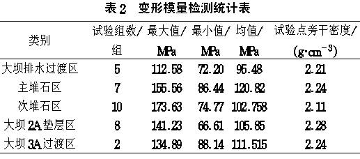 下水庫壩體在上升過程中對各填筑區(qū)進(jìn)行了多次變形模量(淺層平板載荷)試驗(yàn),其檢測成果如表2。