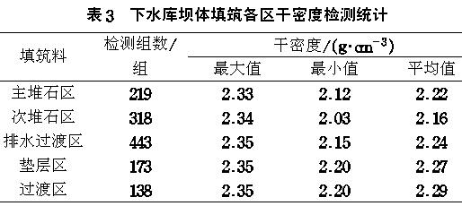 大壩填筑干密度試驗(yàn)均采用灌水法,每個填筑驗(yàn)收單元至少進(jìn)行1個干密度點(diǎn)檢測。各區(qū)干密度檢測情況如表3。