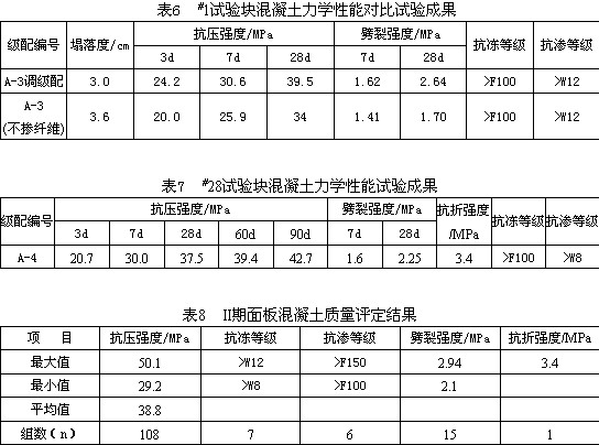 #3試驗塊做了纖維均勻性檢測,含量約為0.88kg/m3,纖維在混凝土中分布較均勻。#1試驗塊用A-3調配合比做一組摻與不摻纖維的對比試驗,試驗結果見表6。#28試驗塊做了增加纖維摻量試驗,纖維摻量由0.9 kg/m3增至1.2 kg/m3,其力學性能指標見表7。二期面板混凝土質量評定結果見表8。