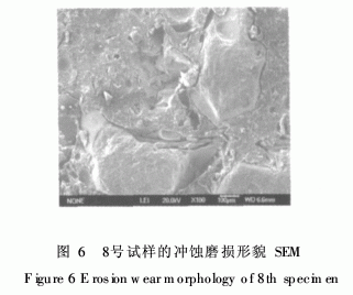 圖6是8號試樣在60°攻角下的沖蝕磨損形貌。從圖中可以看到,在石英砂粒子的水平切削及垂直沖擊作用下,膠體與碳化硅顆粒界面雖有少許疲勞裂紋,但SiC顆粒仍牢牢鑲嵌在膠體固化物中而沒有脫落,材料表面損耗較小,因而耐磨性較高。
