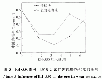 從圖5中可以看到:不論KH-550以何種方式加入,使用量為多少,膠粘涂層的耐沖蝕磨損性相比未加入KH-550時都得到一定的提高,并且復合試樣的耐磨性在膠體具有高粘接強度時較好,其中8號試樣(遷移法KH-550量為3.3%)的沖蝕磨損率最低,為0.11mg/min,1號試樣(KH-550量為0%)的相對耐磨性達5.36。