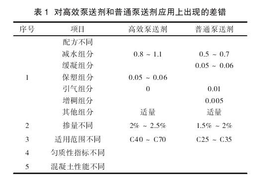 ?。?)商品混凝土公司對高效泵送劑和普通泵送劑性能不夠了解,應用上出現差錯見表1。