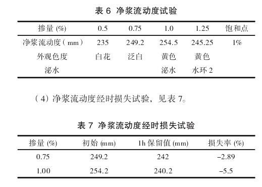 ?。?)試驗結果:不同摻量凈漿流動度試驗見表6。