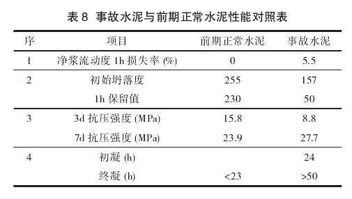 6.6緩凝事故水泥與前期正常水泥試驗結果對比(表8)