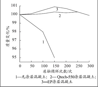 表2為混凝土保護涂層隨凍融循環次數增加的表面情況。從表2中可以看出:EP涂層經50次凍融循環就開始出現微裂紋,250次凍融循環時EP涂層已經大面積脫落,而Qtech-550涂層經300次凍融循環,表面仍完好無損。