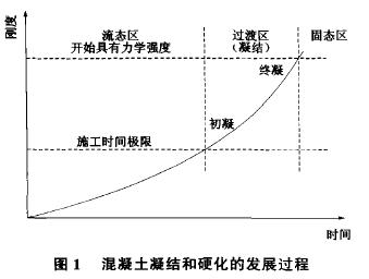水泥的凝結是水泥水化硬化過程中人為劃分的一個階段。用適量水拌和的水泥是一種具有可塑性和流動性的漿體,隨著水化反應的進行,水化產物逐漸填充原來被水所占據的空間,當這些水化產物達到一定數量并彼此接觸構成比較疏松的網狀結構,使漿體失去流動性和部分可塑性,這時稱為初凝。隨著水化反應的繼續進行,水化產物不斷增多,它們相互接觸連生,漿體完全失去可塑性,建立起充滿全部間隙的緊密網狀結構,并在網狀結構內部不斷充實水化產物,使水泥漿體具有抵抗外力的一定強度,這時為終凝。在初凝時間內,水泥漿體保持流動性、可塑性和和易性,施工時必須在初凝時間內完成水泥砂漿或混凝土的攪拌、運輸和澆注等工序。從上述凝結的概念可以看出,要達到凝結,必須有足夠的水化產物在水泥顆粒之間搭接成網狀結構,因此水泥漿的水灰比、水泥的活性及其它影響水化速率的因素均影響水泥的凝結。水灰比大,則水泥顆粒之間的距離大,即毛細孔大,需要較長的時間才能產生足夠的水化產物來填充毛細管空間并相互接觸連生,因此凝結時間要長。水泥活性高,則水化速度快,產生足夠的水化產物填充毛細管空間所需的時間短,凝結時間短。凡是加速水泥水化的因素如堿的存在、水泥顆粒細、水化溫度高等均可使凝結時間縮短,而緩凝劑如石膏的加入可使凝結時間變長。1.2 混凝土的凝結混凝土由水泥、砂、石、水以及礦物摻和料和外加劑組成。它的凝結也是由于水泥與水反應所引起,因此與水泥的凝結密切相關。由于混凝土的水灰比、組成和凝結時間的測定方法和水泥漿體的不相同,因此其凝結時間與配制該混凝土所用的水泥凝結時間也不一致。一般地,混凝土的凝結時間都比水泥的長。與水泥類似,混凝土的凝結也是新拌混凝土失去施工性能而固化的開始,混凝土的凝結時間是從實用出發而人為規定的。初凝表示施工時間的極限,它大致表示新拌混凝土已不再能正常攪拌、澆注和搗實的時間,而終凝說明混凝土力學強度已開始發展,具有一定強度(約為0.7MPa),此后強度以一定的速率增長?;炷聊Y和硬化的發展過程見圖1。