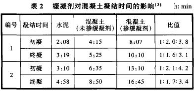 3 緩凝劑對混凝土凝結時間的影響為了適應運輸和施工的要求,預拌混凝土往往要求坍落度經時損失小,為此往往摻人緩凝劑或緩凝型減水劑,此時混凝土的凝結時間比未摻緩凝劑的更長。文獻[3]用2種凝結時間不同的水泥分別配制2組摻與不摻緩凝劑的混凝土,水灰比均為0.54。試驗結果見表2。