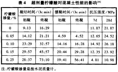 檸檬酸也呈現出相同的規律,超劑量檸檬酸對混凝土性能的影響見表4。