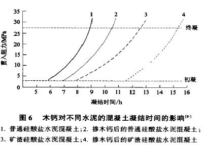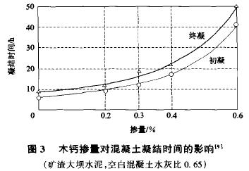 水泥凝結時間太長是混凝土產生超緩凝的主要原因之一,因此不要選擇凝結時間太長的水泥。就水泥品種而論,應首選硅酸鹽水泥和普通硅酸鹽水泥,因為它們的凝結時間比較短。而礦渣水泥、火山灰水泥和粉煤灰水泥由于摻入較多的混合材,凝結時間一般都比較長,混合材摻量越多,凝結時間越長。圖6為木質素磺酸鈣減水劑對普通硅酸鹽水泥和礦渣水泥混凝土凝結時間的影響。