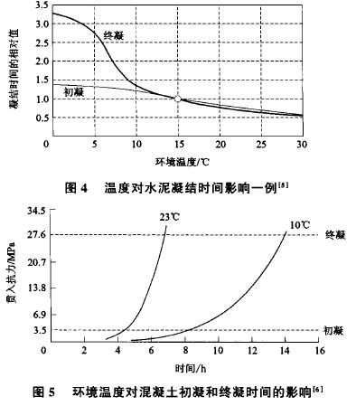 環境溫度對混凝土凝結時間也有很大影響。環境溫度低,水泥水化速度慢,凝結時間延長。圖4為溫度對水泥凝結時間影響的一例[51。以該圖為例,若以環境溫度15℃ 的凝結時間相對值為1.0,那么在10℃ 時初凝時間約為1.2,終凝時間約為1.4;當環境溫度下降至5~C時,初凝時間相對值約為1.3,而終凝時間相對值約為2.6??梢姯h境溫度降低將使水泥凝結時間延長,特別是終凝時間延長更明顯。環境溫度降低對混凝土凝結時間的影響呈現相似的規律。圖5為環境溫度對某混凝土凝結時間的影響 1。從圖可見,當環境溫度從23℃ 降至10℃ 時,混凝土拌和物初凝時間延緩約4h,而終凝時間延緩7h,幾乎都延長了l倍。在摻人緩凝劑的情況下,溫度的影響可能更顯著。因此在環境溫度低的情況下應少摻或不摻緩凝劑,以免出現超緩凝現象。