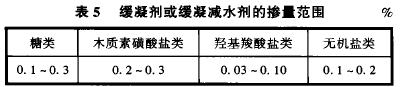 按GBJ 119—88<混凝土外加劑應用技術規范)的規定,緩凝劑或緩凝減水劑摻量(按水泥質量計)見表5。