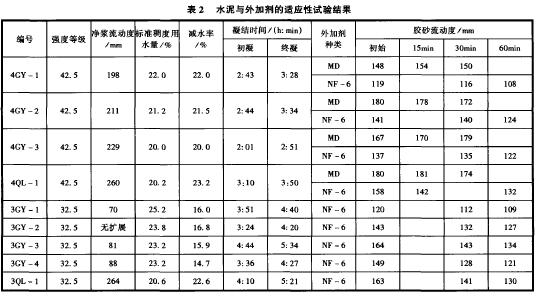 水量看:4GY一3<4QL一1<4GY一2<4GY一1;從流動性看:4QL一1>4GY一1>4GY一3>4GY一2,顯然圈流磨水泥的標準稠度用水量與聯合粉磨水泥相比是較低的,而且其流動性是最好的。無論是需水性還是流動性,4GY一3都與圈流磨水泥幾乎相同。對于32.5水泥而言:標準稠度用水量:3QL一1<3GY一4<3GY一3<3GY一2<3GY一1;流動性:3QL一1>3GY一4>3GY一3>3GY一1>3GY一2。很明顯,圈流磨水泥的標準稠度用水量最小,流動性最好。1.2 水泥與外加劑的適應性試驗條件:1)凈漿流動度測定:水泥300g,水87g,外加劑摻量(液體)為水泥質量的1.5% ;2)外加劑減水率測定:水泥500g,外加劑摻量為水泥質量的1.5% ,通過比較未加外加劑和添加外加劑后的水泥標準稠度用水量計算減水率;3)膠砂流動度測定:水泥450g,ISO標準砂1350g,固定水量180ml,外加劑摻量1.5% ,按GB/T 17671—1999攪拌,按GB/T2419—1994測定。試驗結果見表2。