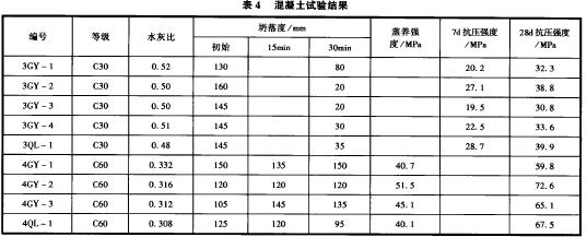從表4可以看出,對于C30混凝土,需水性順序為:3QL一1<3GY一2=3GY一3<3GY一4<3GY一1;在坍落度基本相同情況下,混凝土28d抗壓強度順序為:3QL一1>3GY一2>3GY一4 3GY一1>3GY一3。而從表1可知,水泥28d抗壓強度順序為:3GY一2>3QL一1>3GY一1 3GY一4>3GY一3.其中3GY一1比3GY一3高8.5 MPa,但混凝土28d強度只比3GY一3高1.5 MPa;盡管3QL一1水泥強度不算最高,但3QL一1混凝土7d強度最高,比3GY一1高8.5MPa,比3GY一3高9.2MPa;3QL一1混凝土28d強度最高, 比3GY一1高7.6MPa; 比3GY一3高9.1MPa。很顯然,這都是因為需水性的影響所致。因此,聯合粉磨水泥對泵送混凝土強度有較大影響。而3GY一2與3QL一1混凝土的流動性能及強度相近,因此,聯合粉磨生產32.5級水泥可以參照3GY一2水泥的粉磨控制指標:水泥比表面積控制在400m /kg左右,篩余控制在1.0% ~2.0% 比較合適。注意聯合粉磨比圈流磨水泥需水量增加4%左右。對比表4中C60混凝土試驗結果可以看出,在坍落度相近的情況下:4GY一3混凝土性能最好,雖然需水量高于4QL一1,但只高1.3% ,而且混凝土蒸養強度最高,坍落度損失也最少。因此生產42.5級水泥可以參照4GY一3水泥的粉磨工藝控制指標,比表面積控制在360 In /kg左右,篩余控制在2.5% ~3.0%較好。從表4數據來看,粉磨工藝的改變對蒸養混凝土影響不大。