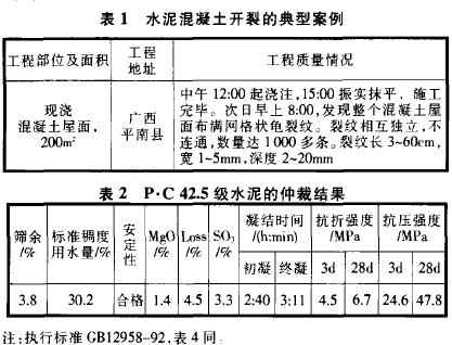 表1為2000年使用P•C 42.5級水泥出現的混凝土開裂的典型案例,混合材主要為造氣渣。該水泥經廠方和用戶雙方共同現場取樣,送仲裁機關檢驗,均為合格品,其結果見表2。