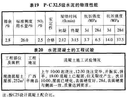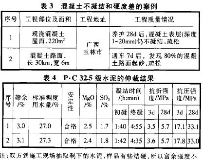 表3是2003年使用P•C 32.5級水泥出現的混凝土表面不凝結和硬度差的案例,混合材主要為黑色石灰石,該水泥經廠方和用戶雙方現場抽樣,仲裁檢驗均為合格品。其結果見表4。