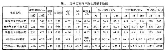 三峽二階段工程通過前期混凝土原材料優選和試驗研究,確定了葛洲壩股份有限公司水泥廠、華新水泥股份有限公司和湖南壩道特種水泥股份有限公司生產的525中熱水泥為三峽二階段工程水泥供應廠家,為使混凝土具有微膨脹性質,三峽工程水泥質量標準TGPS03-1998在GB200-89〈中熱硅酸鹽水泥、低熱礦渣硅酸鹽水泥〉基礎上,對中熱水泥中的MgO含量下限做了不低于3.5%的限制,即要求水泥中MgO含量控制在3.5%~5.0%范圍,表1為三峽工程近期使用的3種中熱水泥基本性能。