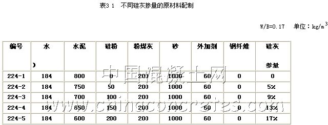 當膠凝材料中硅灰與水泥以何種比例共存時,硅灰能發揮最佳的填充作用,同時能最大限度地與水泥水化產物進行第二次水化反應,從而得到最好的活性粉末混凝土綜合性能,則是配制中因考慮的問題。試驗中考察了硅灰摻量對活性粉末混凝土性能的影響,原材料配制如表3.1所示。
