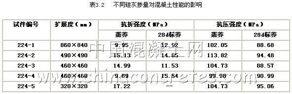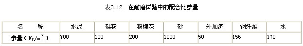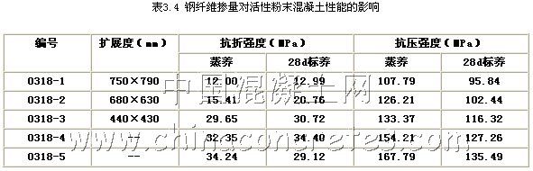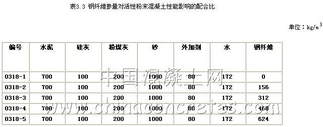 普通混凝土抗拉強度與抗壓強度之比非常低,表現為很大的脆性,而在普通混凝土中經常使用鋼筋來彌補普通混凝土的這方面的不足;從已有的實驗結果表明,活性粉末混凝土的抗拉強度與抗壓強度之比一般為1/8左右,與普通混凝土相比已有很大的提高,但仍然表現為很大的脆性,而通常采取在活性粉末混凝土中加入鋼纖維來提高其韌性。在活性粉末混凝土中加入鋼纖維,能起到較好的增強、增韌作用,但同時又大幅度提高了活性粉末混凝土的配置成本。為此,試圖通過試驗來尋找鋼纖維摻量的活性粉末混凝土在性能和成本上理想結合點,表3.3為鋼纖維摻量對活性粉末混凝土性能影響的配合比。