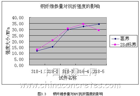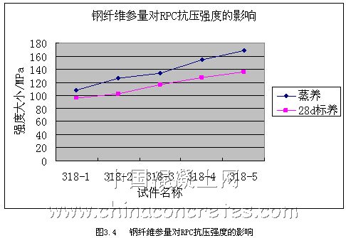 從圖3.7和3.8可以看出,鋼纖維的種類對RPC的抗壓強度影響不是很大,況且加入鋼纖維的目的也是為了加強RPC的韌性,即抗折強度,所以我們在選擇鋼纖維的種類上,應首先考慮其對抗折強度的影響。經過試驗研究和過往經驗,我們在本課題研究中選擇嘉興市經緯鋼纖維有限公司生產的平直型,規格為15-40mm,等效直徑為0.3-0.8mm;長徑比為30~60的鋼纖維。