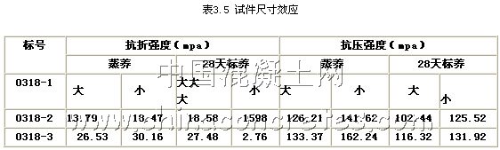 由表3.5和3.6 中我們可以看出對于抗折強度,大試件明顯高于小試件;而對于抗壓強度,小試件又明顯高于大試件。