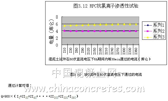 在本試驗中,我們采用電指標顯示 RPC抗氯離子滲透性指標的實驗方法,即(ASTM--C1202-97),本方法是以確定混泥土的電導,來快速顯示混泥土的抗氯離子滲透性,通過監測切取自公稱直徑為102mm的芯樣或圓柱體的厚度為51mm的混泥土薄片試片在6h期間通過的電流,試片一端侵入氯化鈉溶液中,另一端侵入氫氧化鈉溶液中,并在試片兩端施加并保持60V的直流電壓。通過的總電量也是片的抗氯離子滲透性有明顯的關系。據資料可得: