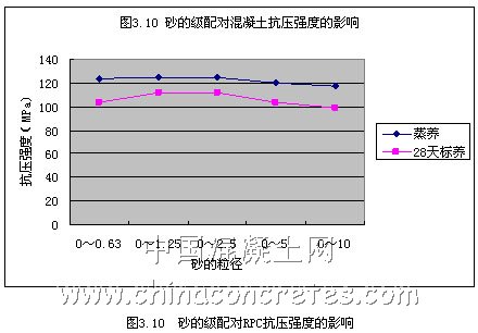 在天然河砂作為RPC混凝土的骨料配制成的RPC漿體中,粒徑范圍窄的砂配制成的漿體的流動度比粒徑范圍寬的同類砂配制成的漿體的流動度要小。砂的粒徑的不同對混凝土抗折強度的影響較大,由圖3.9我們可以看出無論是蒸養還是標養,0~5mm粒徑的砂的抗折強度都是最小的,最高強度值出現在級配為0~1.25的28天標養試件上。對于抗壓強度,由圖3.10我們可以看出,蒸養試件明顯高于標養試件。不同的級配,蒸養的試件之間抗壓強度大小的差別不是很大。