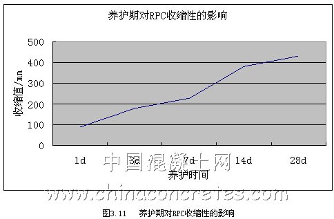 可見,隨著養護期的增長,收縮性的大小也隨之增強。但隨著時間的增加,其收縮性大小會逐漸趨于平緩。RPC是水膠比低,水泥標號較高,水泥用量大而且摻有大量的磨細活性摻合料。這種組成導致早期膠凝材料的水化快,混泥土內自由水迅速消耗,在內部結構密實的同時產生自干燥現象,這種自干燥作用必然引起其宏觀體積縮小,即自收縮。