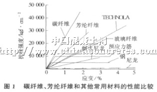 芳綸纖維和碳纖維作為結(jié)構(gòu)補強領(lǐng)域的新型非金屬復(fù)合材料,具備幾個特點:1) 高彈性模量,高抗拉強度;2) 低密度;3) 耐久性好,抗腐蝕、耐老化;4) 疲勞強度高;5) 各項異性;6) 應(yīng)力—應(yīng)變關(guān)系為線性(見圖1) 。