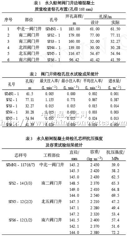 (1) 混凝土取芯成果分析。閥門井井身段共布置取芯孔6個(gè),檢查孔布置情況見表1 ,從取芯成果資料可以看出: ①大部分孔的芯樣多呈長柱狀,表面光滑,混凝土骨料分布均勻,有少量氣泡。鉆孔芯樣獲得率最大為100 % ,最小為98. 2 %優(yōu)良率為100 % ,合格率為100 % ,均滿足設(shè)計(jì)要求。芯樣描述共6 個(gè)孔,孔深297. 69 m ,優(yōu)良長度為292. 33 m ,優(yōu)良率為98. 2 % ,合格長度為294. 4 m ,合格率為98. 9 %。②因?yàn)殚y門井周邊終檢孔的鉆孔孔位距離豎井邊墻混凝土內(nèi)側(cè)很近,最小距離只有6 m ,為避免破壞豎井結(jié)構(gòu)混凝土,閥門井終檢孔不要求做壓水試驗(yàn),需做注水試驗(yàn)。向孔內(nèi)注水并與孔口平,讓孔內(nèi)水自然滲漏,每隔5 min 測讀1 次孔內(nèi)水位下降的長度,以實(shí)測鉆孔孔徑為計(jì)算值,然后計(jì)算出每單位注入水量,總體測讀時(shí)間為30 min。注水試驗(yàn)結(jié)果見表2。③根據(jù)技術(shù)要求及混凝土評定標(biāo)準(zhǔn),永久船閘混凝土終檢孔的優(yōu)良率在80 %以上。④對混凝土芯樣進(jìn)行物理力學(xué)性能檢測,共取樣檢測混凝土芯樣的抗壓強(qiáng)度4 組,表觀密度4 組,試驗(yàn)依據(jù)《水工混凝土試驗(yàn)規(guī)程》(SD105 - 82) 進(jìn)行。抗壓強(qiáng)度及容重試驗(yàn)結(jié)果見表3。由3 表可見:混凝土芯樣抗壓強(qiáng)度優(yōu)良率為100 %。混凝土芯樣抗壓強(qiáng)度試驗(yàn)共計(jì)4組,抗壓強(qiáng)度平均值為59. 2 MPa ,最小值為47. 2 MPa ,達(dá)到優(yōu)等級(jí)評定標(biāo)準(zhǔn)。混凝土表觀密度試驗(yàn)共計(jì)4 組, 容重平均值2 381. 67 kgPm3 ,最小值2 210 kgPm3 。抗?jié)B試驗(yàn)結(jié)果:抗?jié)B標(biāo)號(hào)不小于S8 ,試驗(yàn)結(jié)果滿足設(shè)計(jì)要求。
