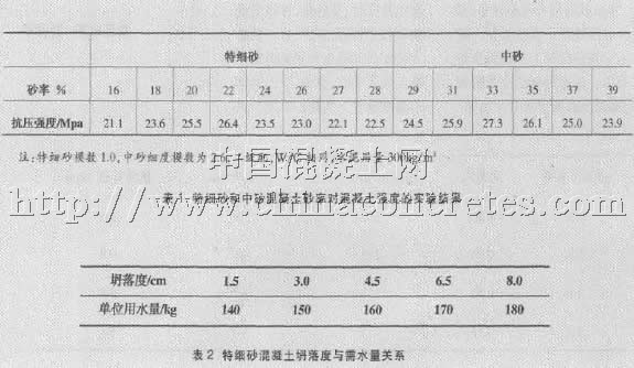 從表1 可以看出, 特細(xì)砂混凝土的強(qiáng)度對(duì)砂率的敏感度比中砂混凝土大, 砂率有10%的差距, 所以在特細(xì)砂混凝土配合比設(shè)計(jì)中, 應(yīng)特別注重最佳砂率的選擇試驗(yàn)。
