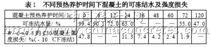 3)水分轉移加之負溫下水泥水化緩慢,致使混凝土結構酥脆。首先應明了,水泥在負溫下的水化不外乎依靠低冰點的毛細水,防凍劑能夠降低混凝土溶液冰點,推動水泥在負溫下初始水化。接著產生水泥水化熱復合防凍劑帶來的微膨脹,形成早強“抗凍結構”的綜合效應。于是相應的對策是:a. 最大限度減少混凝土中的游離水。b. 采取高壓振動、重復振動或引入膨脹劑等措施改善混凝土中毛細水結構。c. 水泥預水化或熱水攪拌延長攪拌時間,促進游離水轉化為凝膠水、結晶水,結晶水是不凍結的。d. 覆蓋養護或混凝土預熱養護,也可緩解凍害;不同預熱養護時間的可凍結水及強度損失見表1 。