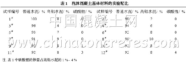 為使化學(xué)發(fā)泡劑的穩(wěn)定性能與泡沫混凝土凝結(jié)硬化性能相匹配,實(shí)驗(yàn)通過(guò)加入少量的高鋁水泥和碳酸鋰來(lái)調(diào)整硅酸鹽水泥漿的凝結(jié)時(shí)間,其配方見表1 。