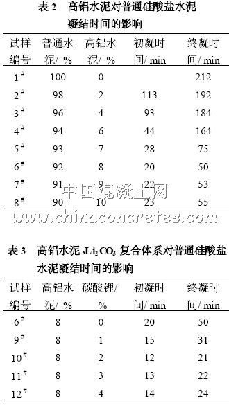 2. 1高鋁水泥、Li2CO3 對(duì)普通硅酸鹽水泥凝結(jié)時(shí)間的影響