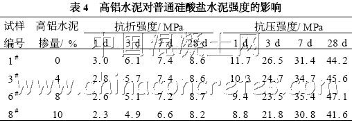1) 高鋁水泥對(duì)普通硅酸鹽水泥強(qiáng)度的影響 眾所周知,復(fù)合化是改善水泥性能采用較多和有效的途徑之一??v觀近年國(guó)內(nèi)外復(fù)合水泥的研究現(xiàn)狀,主要集中在混合材方面,不同系列水泥間的復(fù)合研究很少。在普通硅酸鹽水泥中加入不同比例的高鋁水泥,對(duì)其力學(xué)強(qiáng)度有很大影響,如表4 所示。
