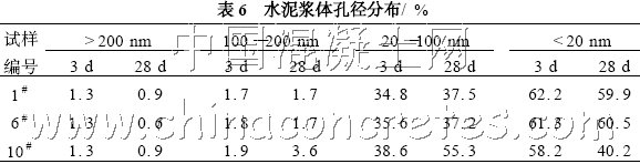 采用壓汞儀對(duì)水化3d、28 d 的1 # 、6 # 以及10 # 試樣的硬化水泥漿體的孔結(jié)構(gòu)及孔徑分布進(jìn)行了測(cè)試,結(jié)果見表6 。
