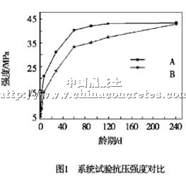 (1) 抗壓強(qiáng)度。圖1 為混凝土抗壓強(qiáng)度的對比曲線,A為基準(zhǔn)混凝土,B 為復(fù)合增鈣液態(tài)渣粉混凝土。從圖中我們可以看出,基準(zhǔn)混凝土的早期強(qiáng)度高于復(fù)合增鈣液態(tài)渣粉混凝土,但是我們可以看到,混凝土標(biāo)準(zhǔn)養(yǎng)護(hù)90d 之后,復(fù)合增鈣液態(tài)渣粉混凝土的強(qiáng)度增長率明顯超過基準(zhǔn)混凝土,在養(yǎng)護(hù)至240d 時(shí),其強(qiáng)度與基準(zhǔn)混凝土基本相同,并表現(xiàn)出更強(qiáng)的上升趨勢。這主要是由于在混凝土的水化過程中,尤其是水化后期,復(fù)合增鈣液態(tài)渣粉與Ca (OH) 2 發(fā)生二次水化反應(yīng),形成C - S - H 凝膠,使得混凝土結(jié)構(gòu)更加密實(shí),后期強(qiáng)度增長迅速。