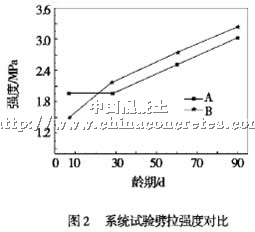 (2) 劈拉強(qiáng)度。圖2 為混凝土劈拉強(qiáng)度對比曲線,A為基準(zhǔn)混凝土,B 為復(fù)合增鈣液態(tài)渣粉混凝土。從圖中我們可以看到,混凝土標(biāo)準(zhǔn)養(yǎng)護(hù)7d 時(shí),復(fù)合增鈣液態(tài)渣粉混凝土的劈拉強(qiáng)度低于標(biāo)準(zhǔn)混凝土,但是,混凝土標(biāo)準(zhǔn)養(yǎng)護(hù)至28d時(shí),其劈拉強(qiáng)度已明顯超過基準(zhǔn)混凝土。這表明:復(fù)合增鈣液態(tài)渣粉取代水泥,對混凝土早期劈拉強(qiáng)度具有一定影響,但由于其優(yōu)化了粉體材料的微級配,混凝土更加密實(shí),隨著養(yǎng)護(hù)齡期的增加,其優(yōu)異性體現(xiàn)明顯。