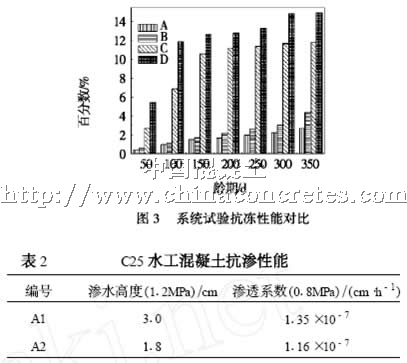 (1) 抗凍性能。文采用快凍法進(jìn)行凍融試驗(yàn),具體數(shù)據(jù)見圖3。圖中A 為基準(zhǔn)混凝土質(zhì)量損失率,B 為復(fù)合增鈣液態(tài)渣粉混凝土質(zhì)量損失率;C 為基準(zhǔn)混凝土相對動(dòng)彈性模量的下降值(即1 - Pn ) ,D 為復(fù)合增鈣液態(tài)渣粉混凝土相對動(dòng)彈性模量的下降值。圖3 的數(shù)據(jù)說明,相對于基準(zhǔn)混凝土,復(fù)合增鈣液態(tài)渣粉混凝土的抗凍性能略有降低,這是因?yàn)轲B(yǎng)護(hù)齡期為28d ,復(fù)合增鈣液態(tài)渣粉的優(yōu)勢還沒有充分體現(xiàn),但二者的抗凍等級均達(dá)到了F350 等級。