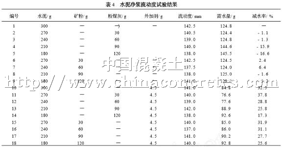 試驗方法采用GB8077 - 87《, 混凝土外加劑均質性試驗方法》, 粉煤灰摻量10 %~40 % ,礦渣微粉摻量10 %~40 % ,等量取代水泥,做不同條件下水泥凈漿流動度試驗,試驗結果見表4 。