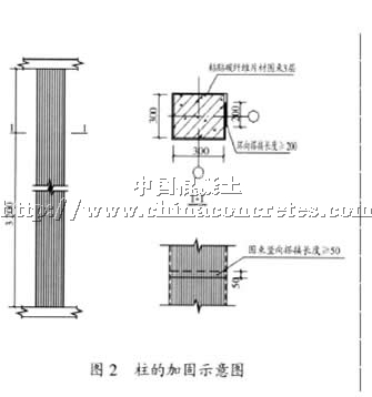 碳纖維片材環向圍束上下層之間的搭接寬度不應<50 mm,環向截斷點的延伸長度不應<200 mm,并且各碳纖維片材條帶搭接位置應相互錯開。混凝土柱加固施工前,必須盡可能地對柱頂荷載進行卸載;矩形截面柱的棱角應打磨加以圓弧,圓弧半徑不應<25 mm。柱的加固示意詳見圖2。