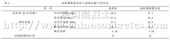 2.1.3 耐久性砼的耐久性關(guān)系到建筑物結(jié)構(gòu)的安全性。目前檢驗(yàn)砼耐久性的指標(biāo)主要有抗凍性、滲透性、抗碳化能力、鋼筋銹蝕作用以及堿骨料反應(yīng)等。高摻量粉煤灰砼抑制堿骨料反應(yīng)已被世界所公認(rèn), 這是由于砼中大量摻入粉煤灰, 吸收了砼中大量的Ca(OH)2和一些堿組分。另外, 高摻量粉煤灰砼的密實(shí)性及孔結(jié)構(gòu)都有很大改善, 滲透系數(shù)很小, 一般在( 1.6×10- 14)~( 5.7×10- 13) m·s- 1。由表1 可知, 高摻量粉煤灰砼的抗凍性、抗碳化能力及對(duì)鋼筋的銹蝕作用與基準(zhǔn)砼( 硅酸鹽水泥砼) 相當(dāng), 其耐久性完全可以滿足現(xiàn)行國(guó)家規(guī)范規(guī)定和工程要求。