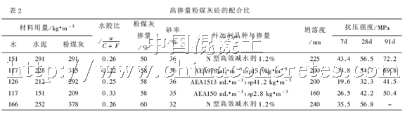 高摻量粉煤灰砼與普通砼對(duì)水泥、集料的要求相同, 在原材料方面的最大區(qū)別是摻和大量的粉煤灰。高摻量粉煤灰砼的水膠比較小, 單位用水量亦較少,須摻加超塑化劑。為使砼拌合物具有好的流動(dòng)性, 一般在摻加塑化劑的同時(shí)還要摻加引氣劑。國(guó)外一些學(xué)者經(jīng)過(guò)研究認(rèn)為, 并不是優(yōu)質(zhì)的粉煤灰才能用于高摻量粉煤灰砼, 只要粉煤灰的質(zhì)量穩(wěn)定, 用低質(zhì)量的粉煤灰同樣可以配制高性能的高摻量粉煤灰砼。