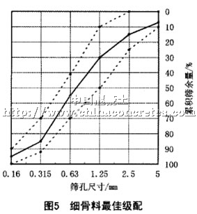 公路工程泵送混凝土的細集料應符合(建筑用砂》(GB/T14684一2001)及(公路工程集料試驗規程》(JTJ一2000)的規定,并應采用中砂。通過0.315mm的篩孔的砂不宜少于15%,且不大于30%,砂率宜控制在40%-50%,通過0.15mm的篩孔砂含量不宜少于5%,其細集料級配選用要好。其最佳級配曲線應符合圖5的要求。