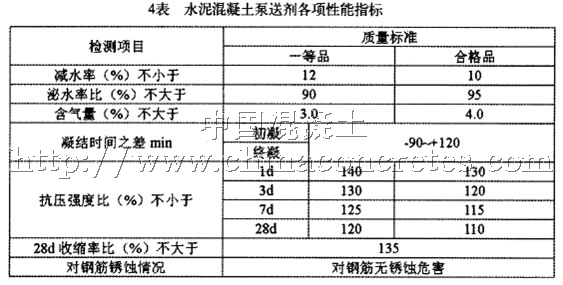 泵送劑首要的是應具備良好的可泵性,所謂可泵性,就是水泥混凝土拌和物具有順利通過輸送管道、不堵塞、不離析、粘聚性良好的性能。泵送劑必須在較長的時間內保持混凝土拌和物具有較高的坍落度,具備足夠的緩凝時間,優良的粘聚性和抗離析性,以利于泵送混凝土的順暢施工。其各項性能指標符合4表要求。