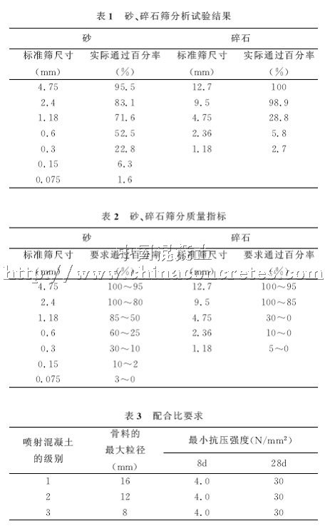 噴射混凝土的設(shè)計(jì)厚度是50mm,應(yīng)此,咨詢確定噴射混凝土等級(jí)為3級(jí)。骨料最大粒徑為9.5mm,混凝土抗壓強(qiáng)度設(shè)計(jì)植為30MPa,水灰比要求在0.35~0.50之間,我們確定設(shè)計(jì)三個(gè)試配水灰比分別為0.50、0.48、0.46。砂和碎石的比例分別為50:50、55:45、45:55;進(jìn)行試配。并且技術(shù)條款要求混凝土試配強(qiáng)度R試=R+R設(shè)×20%,即設(shè)計(jì)混凝土強(qiáng)度乘以1.2的系數(shù)。同時(shí)7d混凝土強(qiáng)度也要滿足R7試=R設(shè)×0.75的強(qiáng)度。
