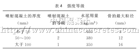 最小粘結(jié)力1MPa,最小抗剪強(qiáng)度為0.5MPa;設(shè)計(jì)抗壓強(qiáng)度為30MPa。噴射混凝土厚度設(shè)計(jì)為50mm。根據(jù)技術(shù)條款要求,骨料的最大粒徑和水泥用量由噴射混凝土的等級(jí)決定。而骨料的最大粒徑又是依據(jù)噴射混凝土的設(shè)計(jì)厚度而確定。見表4所示。
